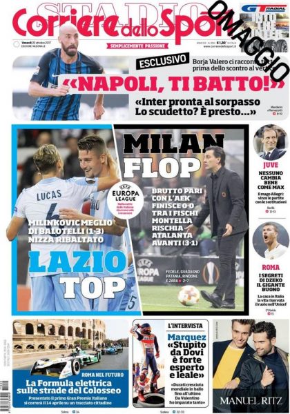 L’edizione di domattina del Corriere dello Sport anticipa un’intervista esclusiva a Borja Valero. Il titolo, in taglio alto, è “Napoli, ti batto!”.
