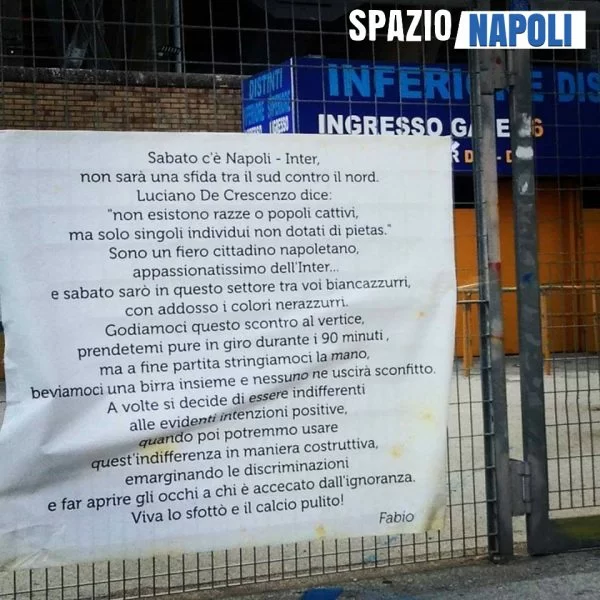 Gran bel gesto da parte di un tifoso di Napoli dell’Inter, Fabio, che ha affisso all’esterno del San Paolo un manifesto in vista del big match di domani sera.