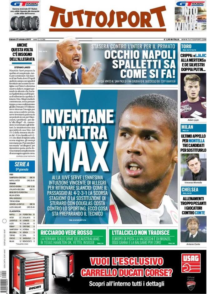 L’edizione odierna di Tuttosport riserva spazio anche al Napoli, mettendolo in guardia dai precedenti fortunati di Spalletti: “Occhio, Spalletti sa come si fa!”, avverte. E, poi, aggiunge: “Ha già vinto al San Paolo“.
