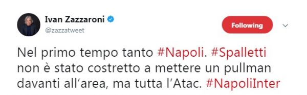 Il giornalista ha infatti commentato su Twitter criticando l’atteggiamento della squadra nerazzurra: “Nel primo tempo tanto Napoli. Spalletti non è stato costretto a mettere un pullman davanti all’area, ma tutta l’Atac“.