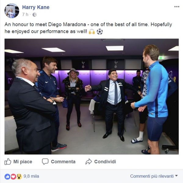 L’attaccante del Tottenham Harry Kane, che a suon di gol sta trascinando la sua squadra a battagliare con i due Manchester nella classifica di Premier League e verso la qualificazione agli ottavi nel girone di ferro in Champions con Real Madrid e Dortmund, ha condiviso sui social la sua gioia per aver incontrato Maradona.