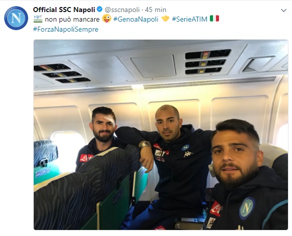“Genoa, stiamo arrivando!” è la didascalia della foto che ritrae un Allan sorridente, mentre in un altro scatto viene raffigurato il trio Sepe, Hysaj, Insigne: “Non poteva mancare” è la scritta che accompagna la foto.