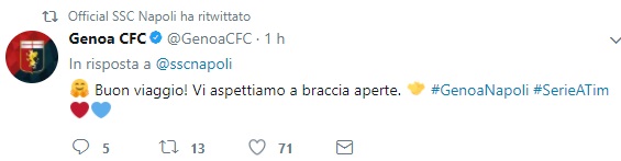 Dopo un po’ il Genoa ha risposto con un altro tweet: “Buon viaggio, vi aspettiamo a braccia aperte!”
