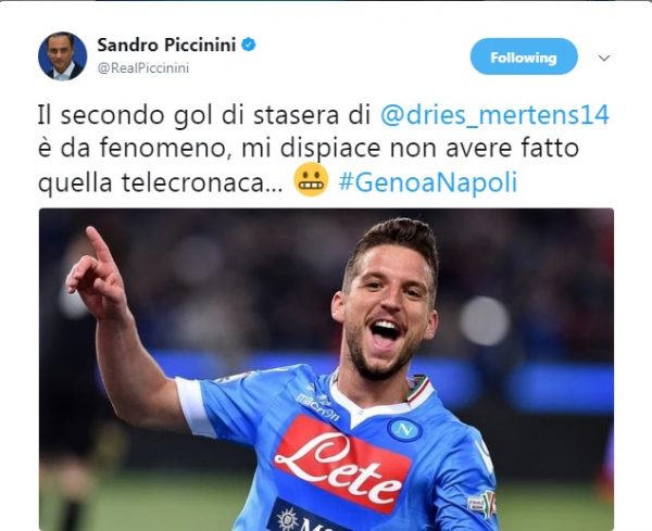 Un gol eccezionale, elogiato anche sui social dal noto telecronista Sandro Piccinini, che su Twitter ha addirittura scritto: “Il secondo gol di Dries Mertens è da fenomeno, mi dispiace non aver fatto quella telecronaca…“.