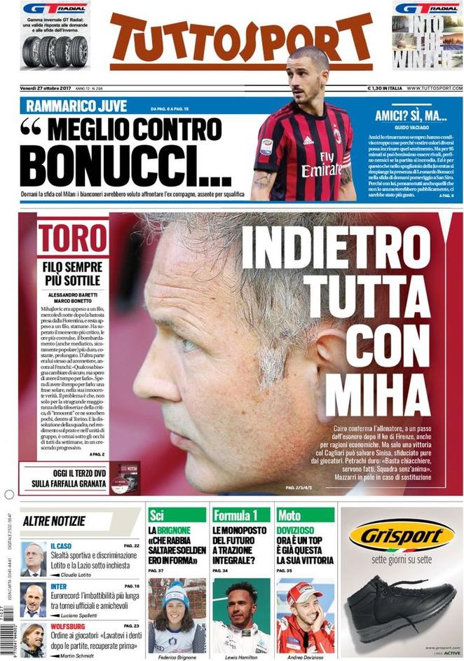 Il quotidiano di Torino dedica la sua prima pagina a Sinisa Mihajlovic, confermato dal Torino ma comunque in bilico. Le prime dieci giornate dei granata hanno deluso le aspettative, oltretutto la mancanza di vittorie e del Gallo Belotti hanno complicato ulteriormente la situazione. Settimana difficile per i granata, complice anche il clamore mediatico che hanno suscitato le dichiarazioni dello stesso allenatore del Toro. Se non arriva la svolta, in panchina in pole Walter Mazzarri. Spazio anche a Milan-Juventus, senza Bonucci, il grande ex, ma sarebbe stato “meglio contro” – fanno sapere i colleghi di Torino.