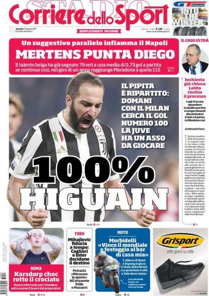Il Corriere dello Sport si focalizza su Gonzalo Higuain, ad una rete dalle cento in Serie A: l’argentino ha il Milan nel mirino, una rete per raggiungere un importante obiettivo e riprendere la continuità con la via del gol. Spazio a sé per Dries Mertens: settantanove reti ad una media di 0,73 a partita. Una suggestione infiamma Napoli: continuando così, con lo stesso score, tra un anno eguaglierebbe Maradona a 115 realizzazioni. Un sogno.