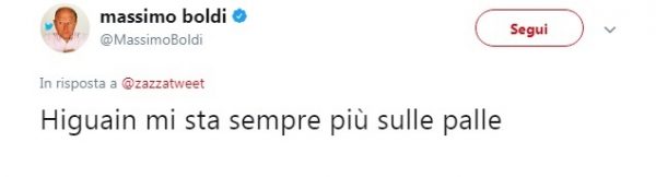 Il punteggio vede i bianconeri in vantaggio per 0-1 al termine del primo tempo grazie ad una rete di Gonzalo Higuain. Decisamente particolare il tweet del comico e tifoso milanista Massimo Boldi che sui social ha commentato manifestando la propria antipatia verso il Pipita: “Higuain mi sta sempre più sulle palle“.
