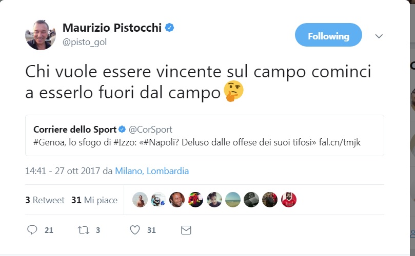Tra queste, il tweet di Maurizio Pistocchi, che bacchetta i tifosi azzurri che si sono macchiati di tale nefandezza: “Chi vuole essere vincente sul campo cominci ad esserlo fuori dal campo“.
