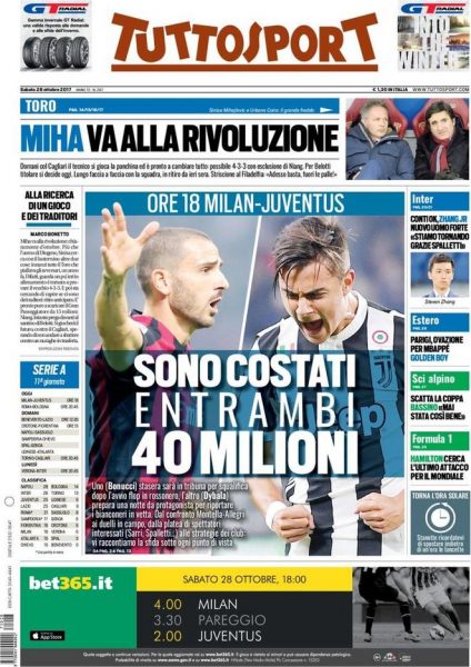Le prime pagine sportive che troveremo tra poche ore in edicola si concentrano sul big match dell’undicesima giornata di campionato, ovvero l’anticipo Milan-Juventus che si giocherà alle ore 18 a San Siro.