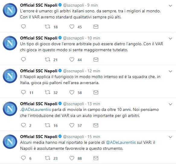 “De Laurentiis parla di moviola in campo da dieci anni, noi pensiamo che sia un aiuto importante. Nel nostro tipo di gioco l’errore arbitrale è dietro l’angolo, con il Var avremo standard più alti” si legge.