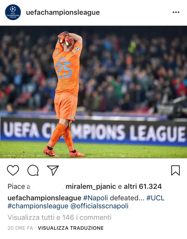 L’account ufficiale della Champions League, su Instagram, nel consueto resoconto di ogni gara, ha postato anche uno scatto dal San Paolo, in cui si vede Pepe Reina disperarsi per il risultato. Fin qui tutto normale.