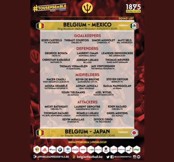 Il ct del Belgio Roberto Martinez ha comunicato la lista dei convocati per le partite con Messico e Giappone. C’è anche Dries Mertens.