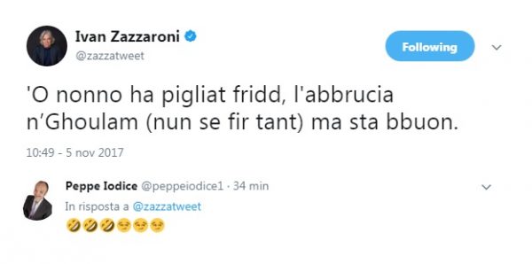 Tra i tanti anche il giornalista Ivan Zazzaroni ha voluto scrivere il proprio commento su Twitter, facendo una simpatica battuta, citando anche il comico Peppe Iodice: “‘O nonno ha pigliat fridd, l’abbrucia n’Ghoulam (nun se fir tant) ma sta bbuon“.