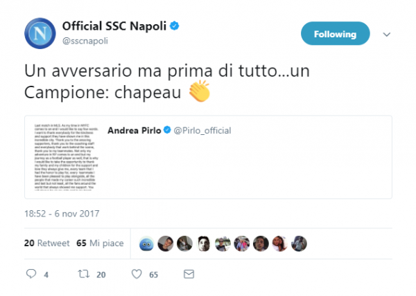 Anche il Napoli ha voluto salutare il campione del mondo 2006 e l’ha fatto con un messaggio su Twitter: “Un avversario ma prima di tutto un campione”.