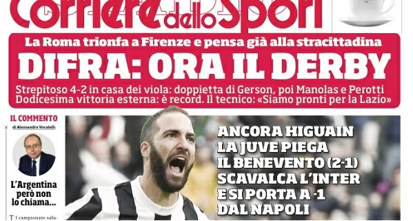 Il Corriere dello Sport dedica l’apertura a Higuain: “Sempre lui! La Juve si porta a -1 dal Napoli“.