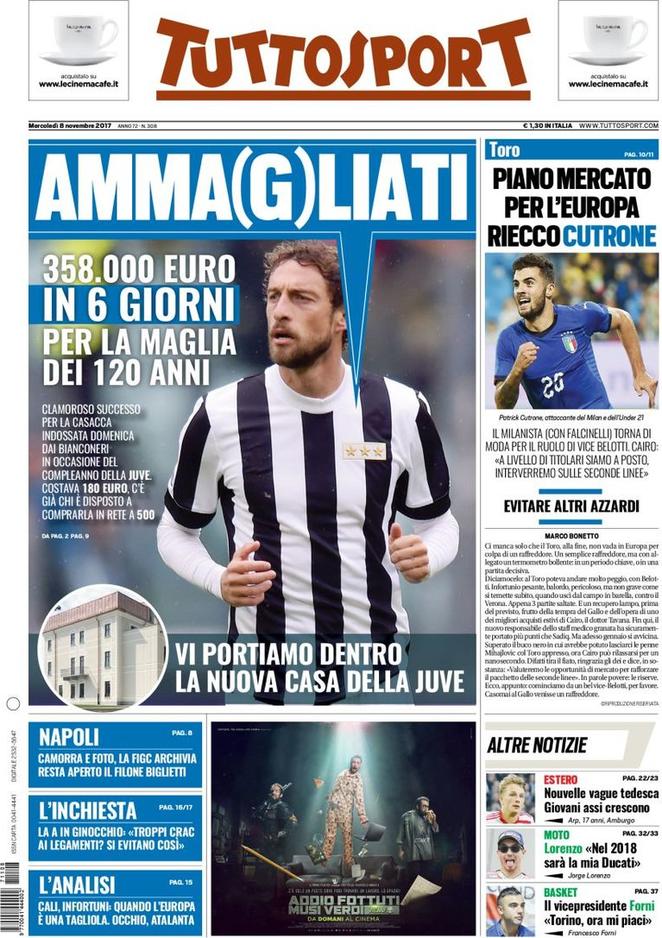 Il quotidiano di Torino dedica la prima pagina alla Juventus e al record di vendite per la casacca bianconera del centoventesimo anno di vita della Vecchia Signora, con numeri esorbitanti e con un modello, lanciato da Adidas, andato letteralmente a ruba. Spazio anche al Torino che pensa a Cutrone come rinforzo per l’attacco in vista di un sogno Europa League che ad oggi è ancora possibilità concreta. Tra gli argomenti trattati da Tuttosport anche le indagini, condotte dalla Procura della Figc, sul Napoli ed i presunti rapporti con il crimine organizzato.