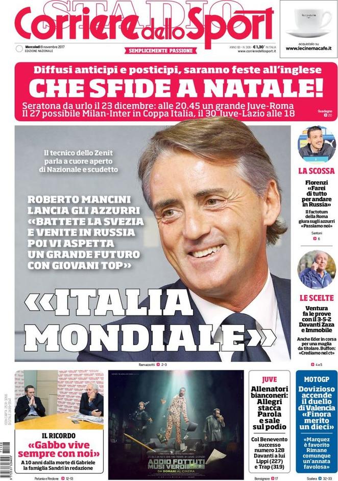 In prima pagina per il Corriere dello Sport l’intervista a Roberto Mancini, tecnico dello Zenit San Pietroburgo. Come ovvio, nella settimana dello spareggio con la Svezia, spazio alla Nazionale, ai dubbi tattici di Ventura e alle parole di Alessandro Florenzi. Occhio particolare anche per le feste natalizie, quest’anno segnate dal grande calcio. Infine, nel decimo anno dell’anniversario della morte di Gabriele Sandri, intervista alla famiglia dell’ultrà laziale.