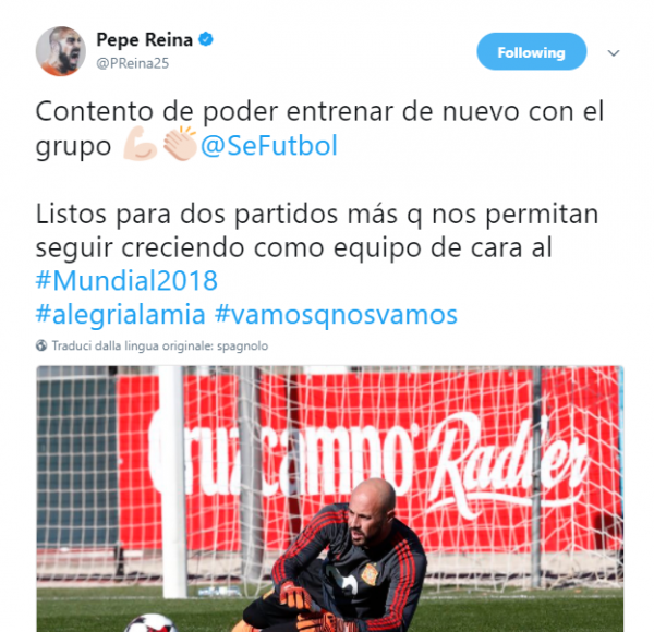 Pepe Reina è tornato ad allenarsi in gruppo con la Spagna questa mattina e l’ha testimoniato con un Tweet: