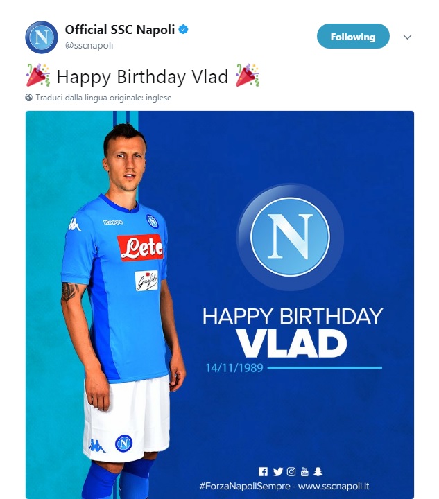 A Chiriches vanno gli auguri di tutta la SSC Napoli. Anche la redazione di SpazioNapoli si unisce agli auguri per il centrale.