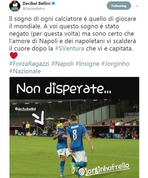 Entrambi molto amareggiati dalla mancata qualificazione dell’Italia, non hanno avuto la possibilità di dimostrare il loro valore. Insigne non è stato chiamato in causa nei 90 minuti decisivi e Jorginho non era mai stato chiamato prima in Nazionale. Questo il messaggio di Bellini: “Il sogno di ogni calciatore é quello di giocare il mondiale. A voi questo sogno é stato negato (per questa volta) ma sono certo che l’amore di Napoli e dei napoletani vi scalderà il cuore dopo la #SVentura che vi é capitata”.