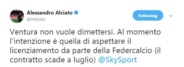 AGGIORNAMENTO 11.45 – Anche il giornalista di Sky Sport, Alessandro Alciato, inviato a seguito della Nazionale, ha confermato con un tweet la decisione di Ventura di non voler dimettersi dall’incarico di CT: “Ventura non vuole dimettersi. Al momento l’intenzione è quella di aspettare il licenziamento da parte della Federcalcio (il contratto scade a luglio) @SkySport“.