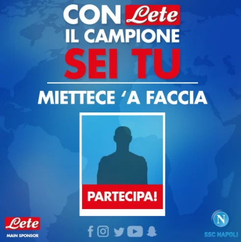 “Acqua Lete in collaborazione con la SSC Napoli presenta “Con Lete il campione sei tu”, un’iniziativa unica dedicata a tutti i tifosi del Napoli in Italia e nel mondo che attraverso una piattaforma digitale, realizzata in lingua italiana ed inglese, potranno dimostrare il loro amore per la maglia azzurra ed entrare a far parte del Napoli FANbook, il primo album di figurine limited edition in cui i protagonisti assoluti saranno proprio loro.