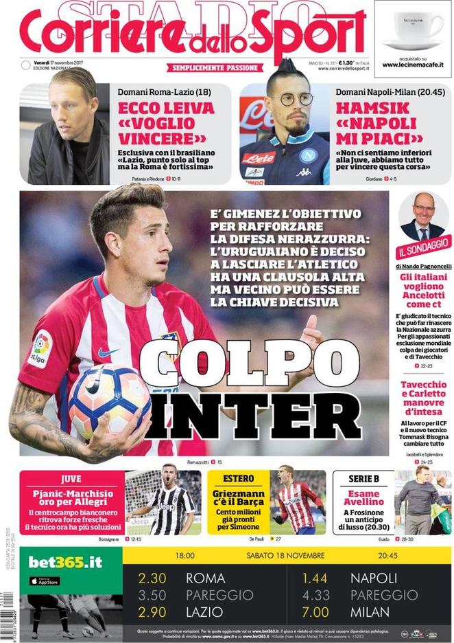 Il Corriere dello Sport apre in prima pagina con un nuovo obiettivo per l’Inter: il difensore Gimenez dell’Atletico Madrid. In alto anteprima con l’intervista al mediano della Lazio Lucas Leiva ed un bel messaggio di carica di Hamsik, che afferma che il Napoli non si sente affatto inferiore alla Juventus.