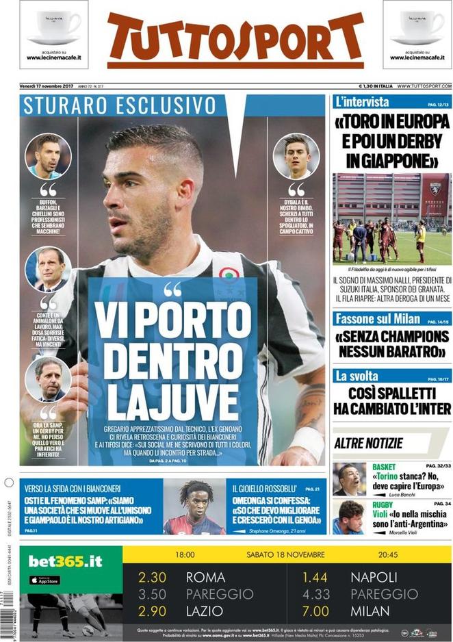 Sono online le prime pagine dei principali quotidiani sportivi in edicola venerdì 17 novembre, andiamole a scoprire.