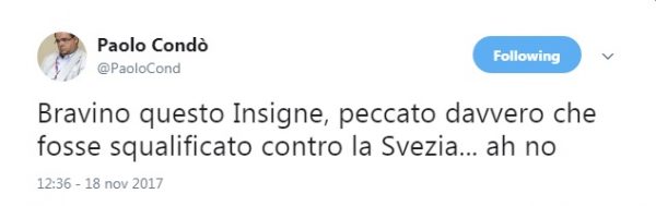 La prestazione dell’attaccante ha aumentato i rimpianti dei tifosi della Nazionale visto il mancato utilizzo del napoletano durante la gara decisiva dei playoff contro la Svezia. Tra coloro che avrebbero voluto di più Insigne in campo c’è anche il giornalista Paolo Condò, che ha pubblicato un tweet alquanto ironico: “Bravino questo Insigne, peccato davvero che fosse squalificato contro la Svezia… ah no“.