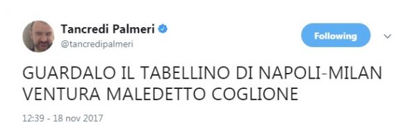 Il tutto ha fatto tornare la mente alla Nazionale e al mancato utilizzo dell’attaccante napoletano contro la Svezia. A sottolineare tutto ciò, con un post alquanto forte, oltre che offensivo, è il giornalista di Bein Sport, Tancredi Palmeri, che su Twitter ha scritto: “GUARDALO IL TABELLINO DI NAPOLI-MILAN VENTURA MALEDETTO COGLIONE“.