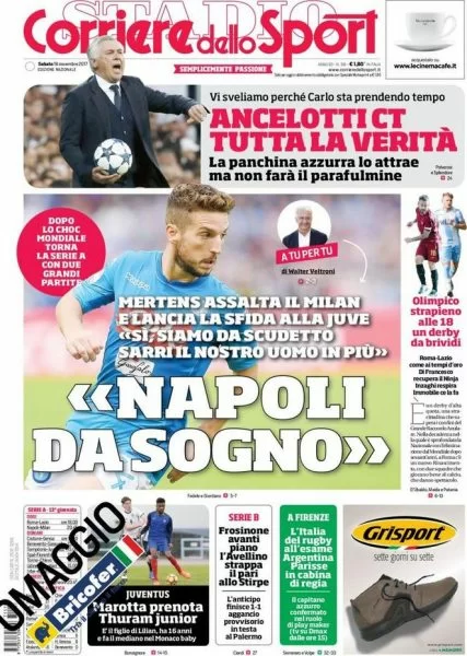 Il Corriere dello Sport invece apre con Mertens e l’intervista, a tu per tu, con Veltroni: “Siamo da scudetto. Sarri il nostro uomo in più, questo Napoli è da sogno” – si legge nelle anticipazioni. Occhi puntati anche sul Derby di Roma e un interessante focus, invece, su Carlo Ancelotti, ormai prescelto per essere il prossimo allenatore della nazionale italiana.