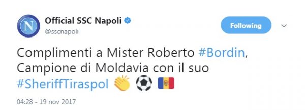 L’ex centrocampista, che nel ’96 fu colpito da un tumore alla tiroide da cui riuscì a guarire, ha ricevuto i complimenti per questo successo anche dalla società partenopea che su Twitter ha scritto: “Complimenti a Mister Roberto #Bordin, Campione di Moldavia con il suo #SheriffTiraspol 👏 ⚽️ 🇲🇩“.