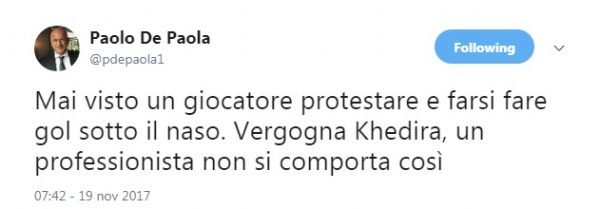 Ciò ha scatenato le ire del giornalista che su Twitter si è sfogato scrivendo: “Mai visto un giocatore protestare e farsi fare gol sotto il naso. Vergogna Khedira, un professionista non si comporta così“. E poi ha aggiunto: “Juve, più fighette che giocatori veri. Ci sarà molto da rivedere…“.