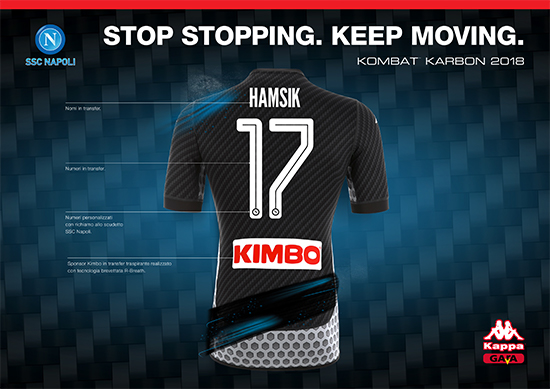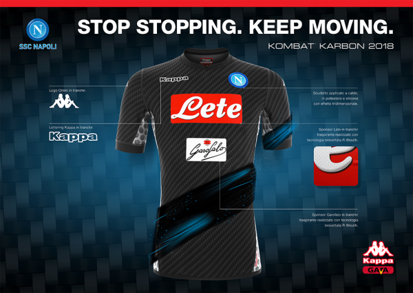 Il gioco in campo è sempre più rapido e muscolare, il ritmo si alza ancora. La Kombat™ si evolve e diventa Karbon. Nel 2018 l’SSC Napoli vestirà una maglia dal design aggressivo, con una texture geometrica in contrasto colore giocata sui diversi toni del grigio. Il Centro Ricerca e Sviluppo Kappa® si è ispirato a cromie e struttura del carbonio per esaltare le performance offerte dalla Kombat™ in termini di dinamicità e reattività. Il principio tecnico dello Stop Stopping (funzione antitrattenuta) si accompagna ora a una grafica ergonomica che rende ancora più visibili agilità, potenza e accelerazioni del gesto tecnico. La Kombat™ Karbon si muove più veloce e gioca con il vento.