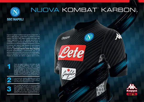 Il gioco in campo è sempre più rapido e muscolare, il ritmo si alza ancora. La Kombat™ si evolve e diventa Karbon. Nel 2018 l’SSC Napoli vestirà una maglia dal design aggressivo, con una texture geometrica in contrasto colore giocata sui diversi toni del grigio. Il Centro Ricerca e Sviluppo Kappa® si è ispirato a cromie e struttura del carbonio per esaltare le performance offerte dalla Kombat™ in termini di dinamicità e reattività. Il principio tecnico dello Stop Stopping (funzione antitrattenuta) si accompagna ora a una grafica ergonomica che rende ancora più visibili agilità, potenza e accelerazioni del gesto tecnico. La Kombat™ Karbon si muove più veloce e gioca con il vento.