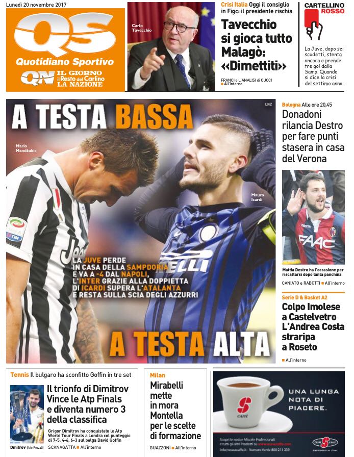Ovviamente il clamore per la sconfitta della Juve trova spazio tra i titoli di tutti i giornali, insieme all’ascesa dell’Inter e senza dimenticare la questione Tavecchio.