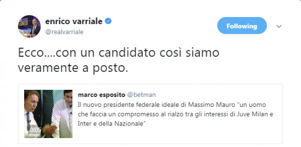 Il giornalista di Rai Sport, Enrico Varriale, ha scritto un tweet decisamente polemico nei confronti di Massimo Mauro. L’opinionista di Sky Sport, infatti, nella giornata di ieri aveva rilasciato alcune dichiarazioni a riguardanti il nuovo presidente della FIGC: “Serve un uomo che faccia un compromesso al rialzo tra gli interessi di Juve, Milan e Inter e della Nazionale“.