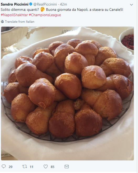 Il giornalista Sandro Piccinini è arrivato questa mattina a Napoli in vista del match di stasera Napoli-Shakhtar, per il quale si occuperà della telecronaca. Subito si è concesso una prelibatezza napoletana: il babà.