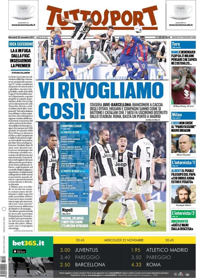 Da Torino snobbano il Napoli: è pur sempre vero che la Juventus questa sera giocherà contro il Barcellona ma nessun accenno al trionfo degli azzurri appare quantomai strano. I colleghi di Tuttosport incitano a modo loro la Vecchia Signora, auspicandosi una Juve come quella che, nella scorsa primavera, fece fuori i blaugrana dalla Champions, andando in finale (poi persa contro il Real Madrid, n.d.r). Spazio anche al Torino e a due colpi come Niang e Berenguer che finora non hanno convinto né soprattutto dato l’apporto sperato.