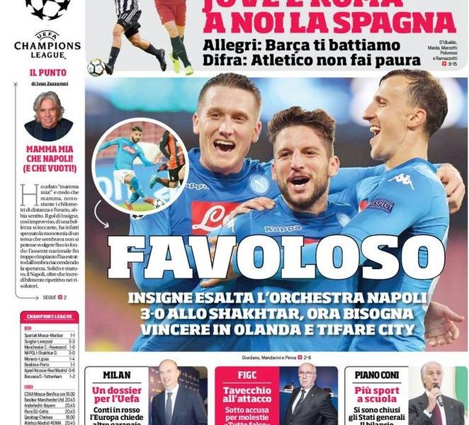 Di tutt’altra materia si occupa il Corriere dello Sport che mette il Napoli sulla sua prima pagina con tanto di “Favoloso”, un titolo che descrive al meglio la squadra di Sarri che ieri ha battuto per 3-0 lo Shakhtar Donetsk al San Paolo. Spazio ovviamente anche alla Juventus e a quanto riguarda il calcio italiano: dai grattacapi del Milan con l‘UEFA, alla FIGC fino ad arrivare ai piani del CONI.