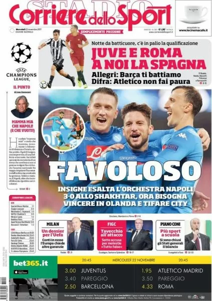 Di tutt’altra materia si occupa il Corriere dello Sport che mette il Napoli sulla sua prima pagina con tanto di “Favoloso”, un titolo che descrive al meglio la squadra di Sarri che ieri ha battuto per 3-0 lo Shakhtar Donetsk al San Paolo. Spazio ovviamente anche alla Juventus e a quanto riguarda il calcio italiano: dai grattacapi del Milan con l‘UEFA, alla FIGC fino ad arrivare ai piani del CONI.