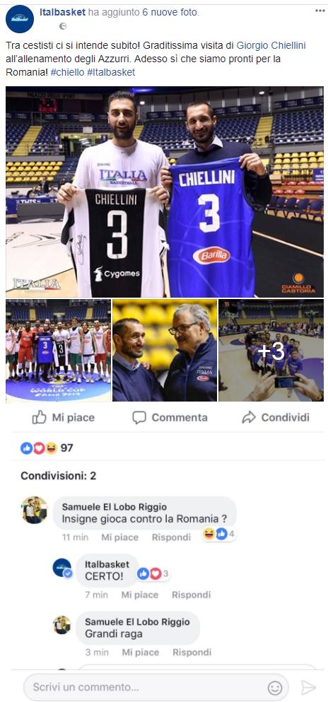 Sul social, a testimoniare questa ossessione degli italiani, ci ha pensato un tifoso dell’Italbasket. In occasione della visita da parte di Chiellini alla nazionale di pallacanestro il giorno di Italia-Romania, il profilo Facebook dell’Italbasket ha postato le foto della presenza del difensore juventino.