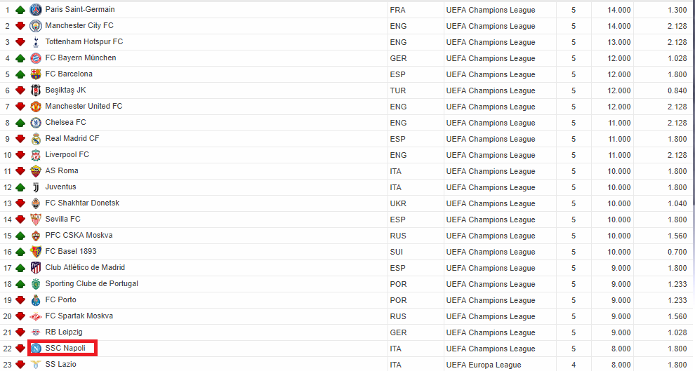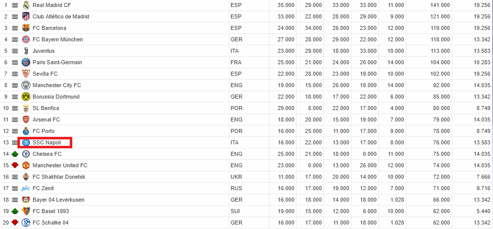 Buon piazzamento per il Napoli, saldo al tredicesimo posto a pochi punti dal Porto. Ricordiamo che i ranking, insieme a quelli delle quattro stagioni precedenti, determinano le teste di serie nei vari sorteggi delle competizioni UEFA.