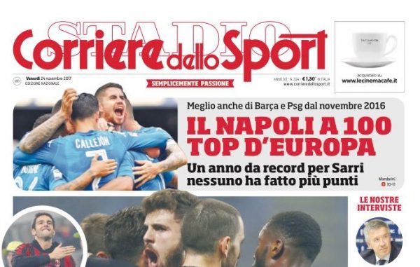 Il Corriere dello Sport, poi, esalta il Napoli: “Top d’Europa, meglio anche di Barcellona e Psg. Nessuno ha fatto più punti”.