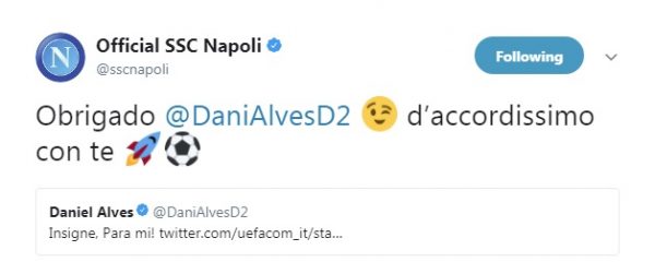 AGGIORNAMENTO – Il Napoli ha risposto al tweet di Dani Alves con un messaggio di ringraziamento.