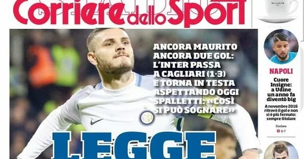 Il Corriere dello Sport apre con la vittoria dell’Inter: “Legge Icardi“. In taglio alto il rinnovo di Messi con il Barcellona: “Messi è d’oro, firma record. Clausola da 700 milioni e per lui 120 in tre anni“. Di spalla spazio al Napoli: “Cuore Insigne, a Udine un anno fa diventò big“.