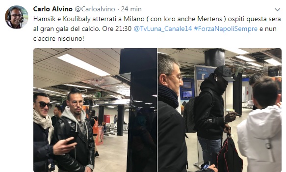 “Hamsik e Koulibaly atterrati a Milano ( con loro anche Mertens ) ospiti questa sera al gran gala del calcio. Ore 21:30 @TvLuna_Canale14 #ForzaNapoliSempre e nun c’accire nisciuno!“, così scrive Alvino che dunque rinnova l’appuntamento a questa sera per seguire l’evento anche su TV Luna.