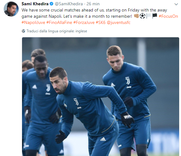 Sami Khedira è carico per la sfida di venerdì. Il centrocampista della Juventus ha pubblicato su Twitter un messaggio in vista della gara del San Paolo. “Ci aspettano dei match cruciali – scrive – a partire dalla sfida di venerdì, quella contro il Napoli”.