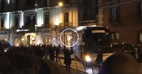 C’è attesa a Napoli per l’arrivo della Juventus all’Hotel Parker. Tanti i tifosi, sia azzurri che bianconeri, che si trovano sul Corso Vittorio Emanuele. Non sono mancati cori e sfottò tra le tifoserie.