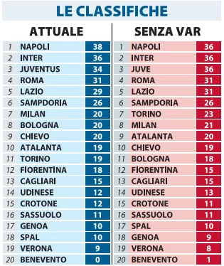 Secondo le valutazioni di Libero, il gap in punti fra Napoli e Juventus sarebbe ridotto senza le segnalazioni VAR: “Napoli e Juventus, infatti, si troverebbero in vetta a pari merito con l’Inter: due punti in meno ai partenopei, due in più ai bianconeri. Ballano quattro punti, in sostanza, colpa di due partite, cioè Napoli-Milan e Atalanta-Juventus, che senza Var sarebbero finite con punteggi diversi.”